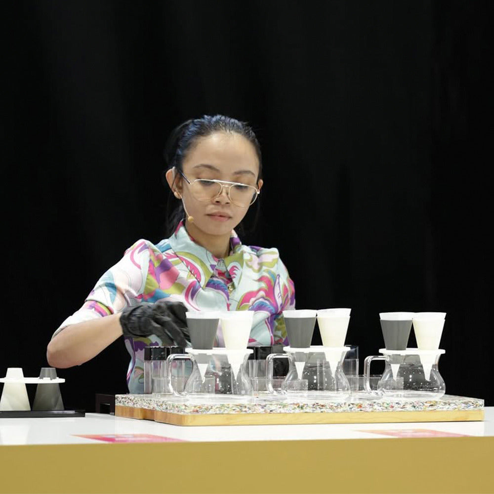 The Binocular Dripper was developed by Mariam Erin, a multiple national coffee champion and World Championship competitor. Her experience across competition brewing, sensory evaluation, and food technology shaped a brewer focused on control, clarity, and practical use.